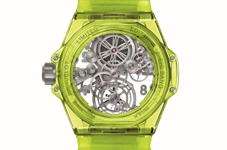 ▲宇舶應用航太工業常用的藍寶石氧化鋁及稀土礦物SAXEM制作Big Bang陀飛輪表殼,此次品牌全新調配出螢光黃色讓人眼睛一亮。