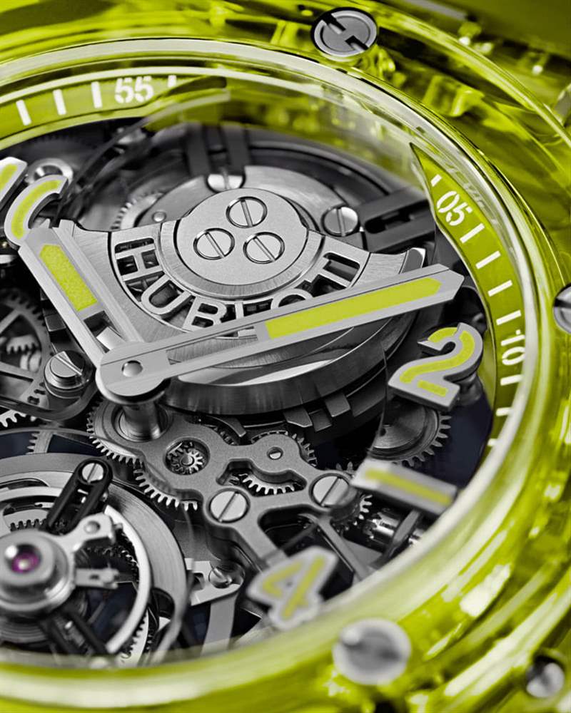 除了前置微型自動盤與6點方向的陀飛輪裝置讓人忍不住多看幾眼,機芯的橋板、桶形橋、自動橋和陀飛輪框架橋板皆由透明藍寶石材質制成,這讓機芯看起來不只鏤空,甚至還向懸浮在表殼內部一般,其實宇舶是利用透明材質的特性,營造奇特視覺效果同時,也顧及了機芯結構的穩定性。另外面盤的2、4、8、10點方向都有阿拉伯數字時標,與表帶的邏輯一致,宇舶選擇在時標與指針添上螢光黃色的夜光物料,如此既能與表殼顏色呼應,也讓佩戴者在鏤空面盤上更容易辨識時間,講究的設計是手表狂野外型之下值得細細品味的精髓。