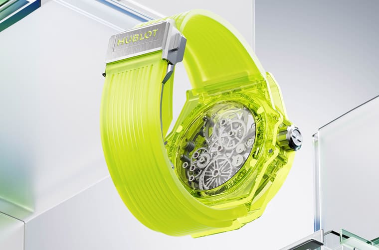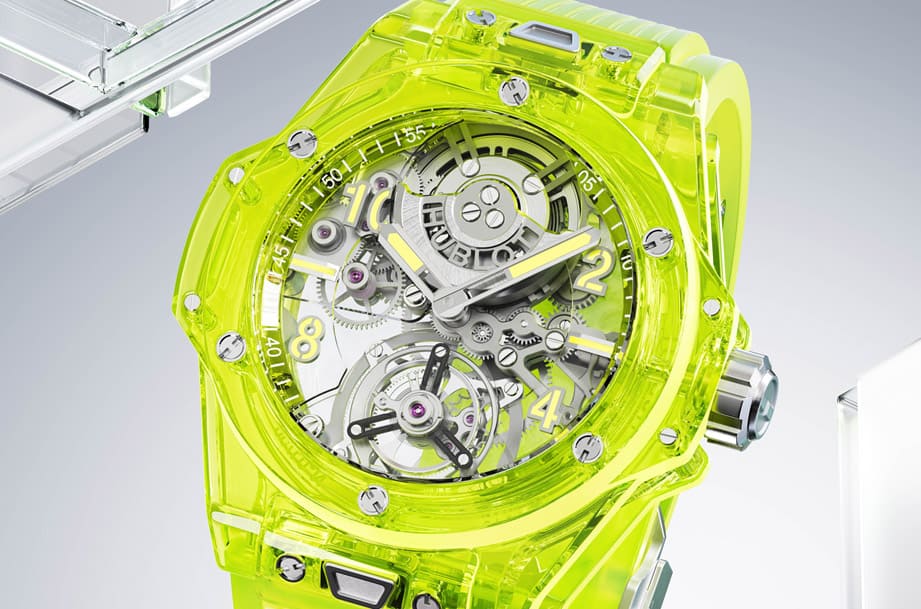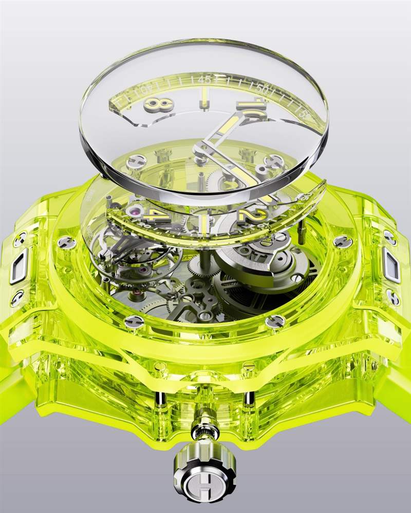 HUBLOT宇舶2023年新作Big Bang陀飛輪螢光黃SAXEM手表承襲2019年的Big Bang MP-11 SAXEM手表而來,有別于后者的綠色SAXEM材質表殼,品牌耗時三年調配出表壇首見的螢光黃色調SAXEM表殼,再度突破我們對「透明手表」的印象。