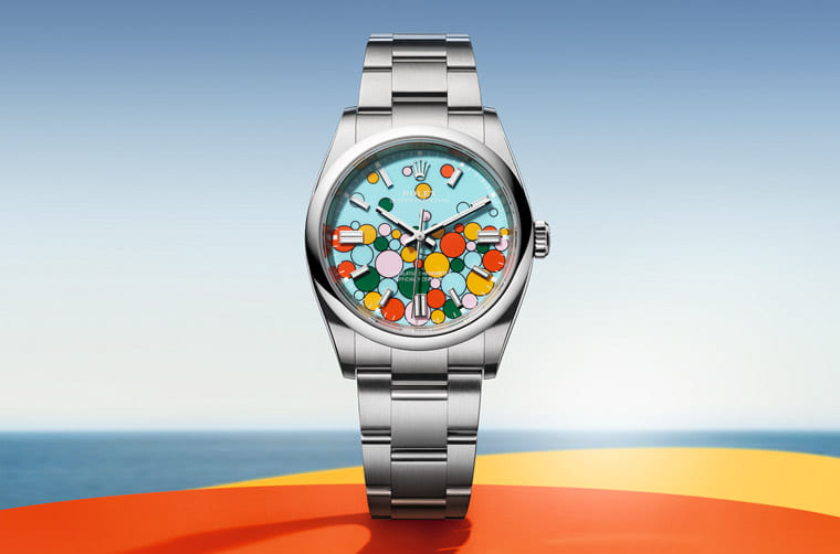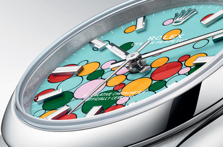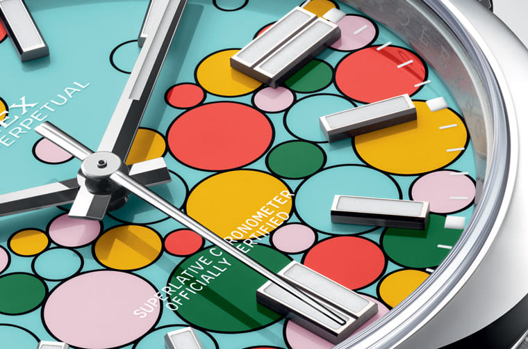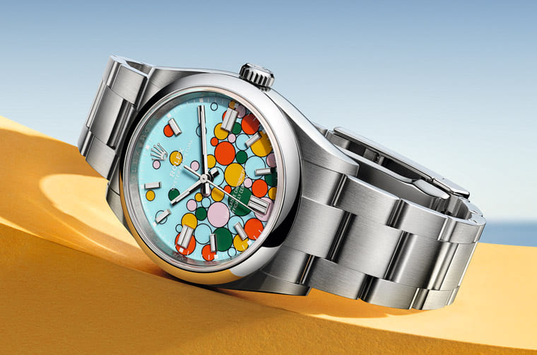 ROLEX勞力士在2020年~2022年旋風式地刮起了一陣Oyster Perpetual熱潮,因為品牌在這個入門而且之前又比較冷門的系列中引進了彩色漆面設計,有點要向1970年代Datejust和Day-Date的Stella彩色面盤致敬的味道,結果這個無心插柳的新設計大大改變了整個OP系列的命運讓它一夕爆紅,不過品牌卻是見好就收,彩色漆面的Oyster Perpetual上市不過三年就逐漸減少各尺寸不同顏色的款式。想不到勞力士2023年又無預警發表同樣擁有漆面設計的新款OP,這次是在面盤同時放上之前彩色漆面OP出現過的五種顏色,看起來猶如面盤冒出彩色氣泡般,帶來青出于藍的炫目視覺效果。