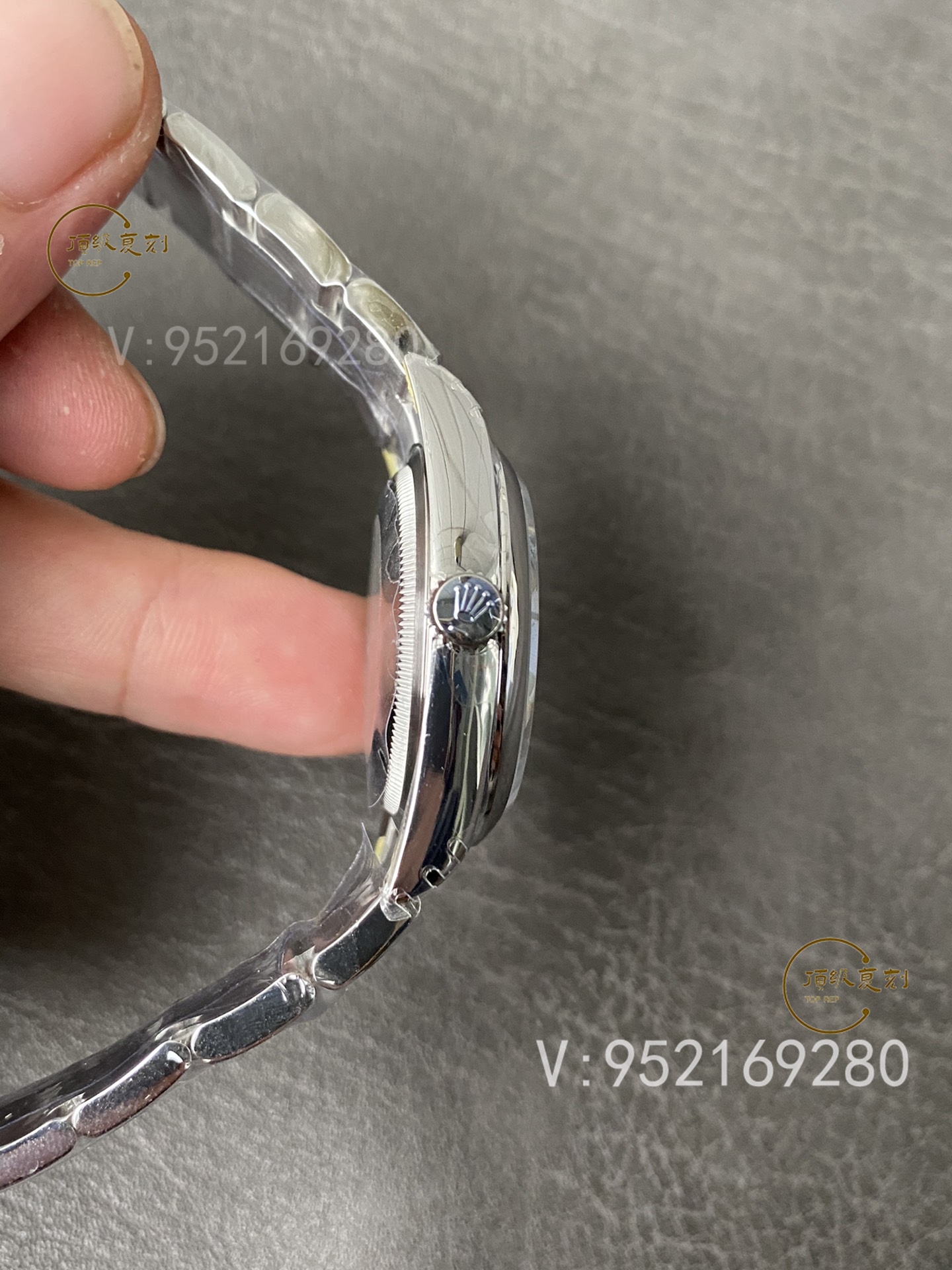 第三是表帶對比。此次VS廠出貨也是拿了幾塊蒂芙尼藍蠔式來看,可以看到這款蠔式恒動鋼帶縫隙比較大,是能夠看到螺栓的,導致表帶比較松散。而EW廠最近的出貨反而這方面做的更好,縫隙更緊致佩戴也舒適。不知道是不是第一批出貨的原因,以后會不會糾正就看后續了。不過表帶的拉絲工藝來說則是VS廠更到位,看不到拉絲的紋路但是更細密,光澤更強。