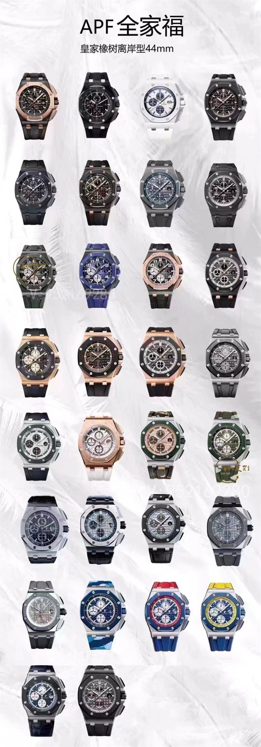 這個APF就是JF廠隕落后出來的老板,除了APF除外,還有好幾家做這款離岸型AP的,總體做工都接近。APF方面基本是基于老款的JF去改良一下,比如說頭粒的活動范圍等。在機芯篩選上也沒以前JF計時AP多問題。老款JF廠出貨基本10個有3-4個要更換的,機芯問題較多缺乏質檢。作為APF廠提供的款式已經夠玩了,本文貼一下廠家提供的配色。
