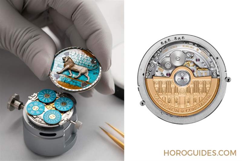 表盤40mm的狹小范圍內(nèi),采用多種工藝再現(xiàn)各個時代的裝飾藝術(shù)與文字元素。整個面盤上布局著極為精細的相關(guān)背景圖紋,最外緣再裝飾一圈浮雕飾帶,將每個時期的藝術(shù)精髓濃縮其中。江詩丹頓運用了內(nèi)填琺瑯和灰階琺瑯、寶石細鑲、石質(zhì)微砌馬賽克、以及經(jīng)由手工雕刻的金質(zhì)鑲貼工藝,完成表盤上色澤、質(zhì)感變化細膩豐富的畫面。
