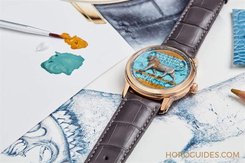 這款回望波斯帝國大流士一世時代的作品,表盤上的裝飾主題取材自波斯帝國宮殿的重要標(biāo)識-由矽質(zhì)釉面磚與石灰砂漿混合制作而成的雄獅浮雕檐壁。由于雄獅指示浮雕檐壁的一部份,因此要再現(xiàn)這項元素便需要還原宮墻上的釉面磚質(zhì)感。江詩丹頓取用綠松石和黃色血斑碧玉進行寶石細鑲工藝,打造壁畫效果。表盤外緣的三角形裝飾圖案以鐫刻金屬和內(nèi)填琺瑯制作而成,取自大流士宮殿內(nèi)的弓箭手浮雕檐壁。