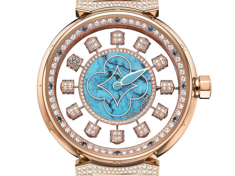 Louis Vuitton?剛剛推出2枚「Tambour Spin Time Air」時(shí)光飛旋腕表新作,特別之處在于首次使用天然寶石切片制作表盤,獨(dú)家設(shè)計(jì)的旋轉(zhuǎn)時(shí)標(biāo)方塊同樣采用鉆石及彩色寶石裝飾,展現(xiàn)出華貴的珠寶質(zhì)感。