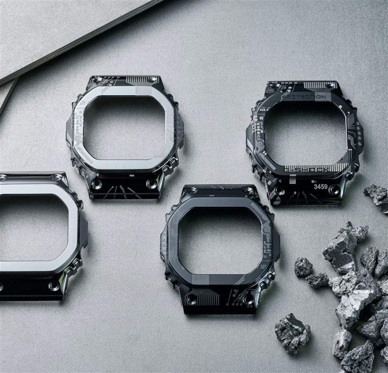 「TranTixxii」鈦合金制作,其硬度是純鈦的兩倍,具有優(yōu)異的抗腐蝕性。電路板圖案的設(shè)計靈感來自腕表所搭載的石英機(jī)芯電路,首先用
