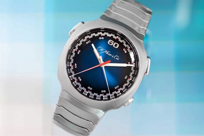 而另一款Streamliner Flyback Chronograph Automatic Funky Blue,則以H. Moser & Cie. 標志性的電光藍為表盤主色調,而作為一枚飛返計時表,都是非常獨特搶眼!同時間,H. Moser & Cie.將可讀性放在第一位,以紅色及白色刻度環繞電光藍表盤邊緣,外側軌道測量秒數,內側軌道則計算分鐘數,亦特別采用紅色秒針,分針則是鍍銠,令人輕易閱讀計時,望著秒針在Funky Blue的表盤上旋轉,也是一種樂趣!