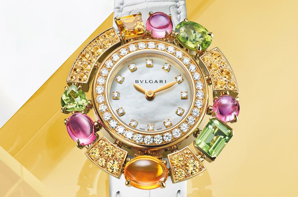 Allegra系列不只有珠寶作品,寶格麗亦將「時間即珠寶」的理念帶入生活,打造最新的雞尾酒珠寶腕表。腕表將碧璽、黃水晶、玫瑰榴石和橄欖石,以各種充滿歡樂的造型呈現,并搭配粉色或黃色剛玉點綴,持續以率性歡快的質感吸引女性目光,宛如手腕上綻放的嬌艷花朵垂涎欲滴,讓人一見傾心。