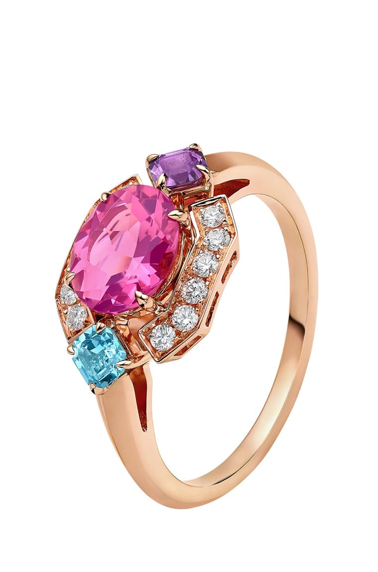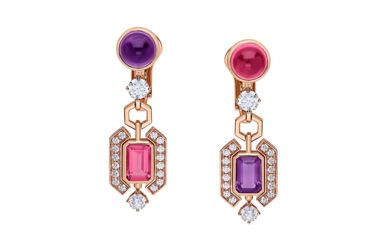 另外還有兩只成對的戒指,一款為玫瑰金,中央鑲嵌粉紅碧璽;另一款則為黃K金,中央鑲嵌海水藍寶。還有一組色彩呈對比的彩寶玫瑰金耳環,點綴紫水晶與粉紅碧璽,整體搭配得宜,展現佩戴者的個性魅力。
