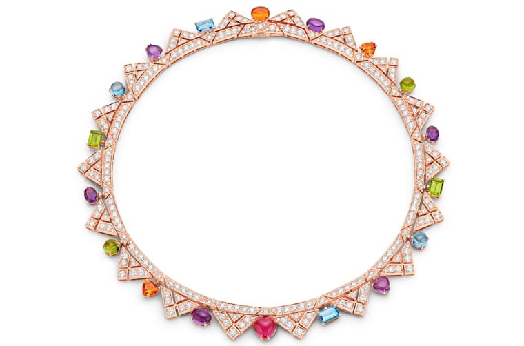 Allegra系列有一款項鏈鑲嵌紫水晶、黃水晶、橄欖石與藍色拓帕石,在玫瑰金幾何元素環繞之中,明亮切割鉆石端坐于所有角落,18顆彩色寶石得以歡欣的姿態與微妙的美感,呈現充滿興味的作品。