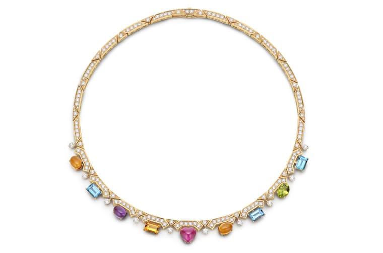 Allegra系列黃K金項鏈鑲嵌了橄欖石、碧璽、黃水晶以及藍色拓帕石,并以將近6克拉的耀眼鉆石襯托出大自然結晶的繽紛之美。