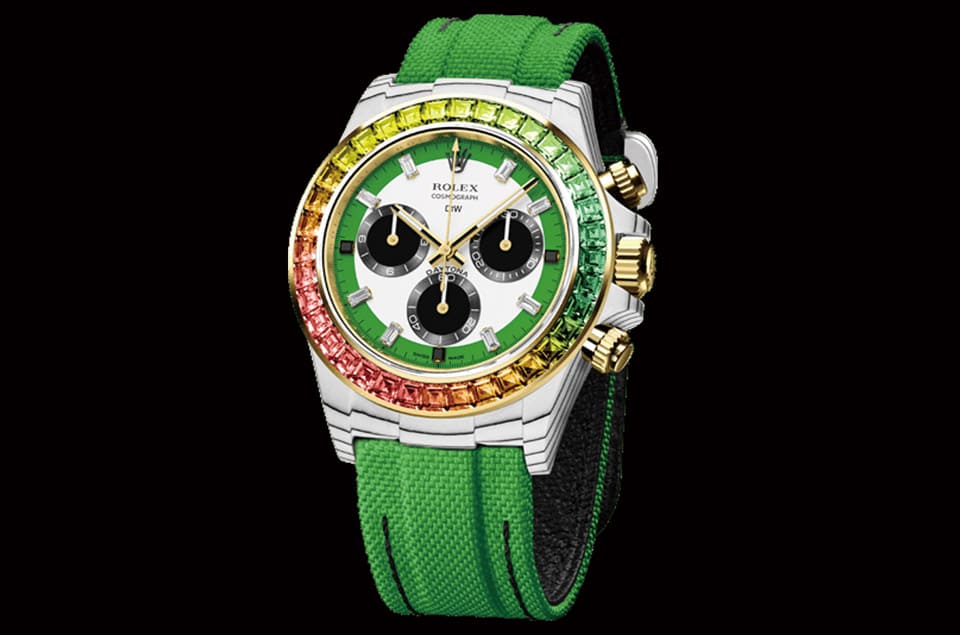 ▲DiW打造出表圈鑲有綠色調彩色寶石組合的Daytona改表,手表名為”Wild Green”,由寶石串連的色彩層次效果的確讓人有「狂野」的感受。Source:Designa Individual Watches