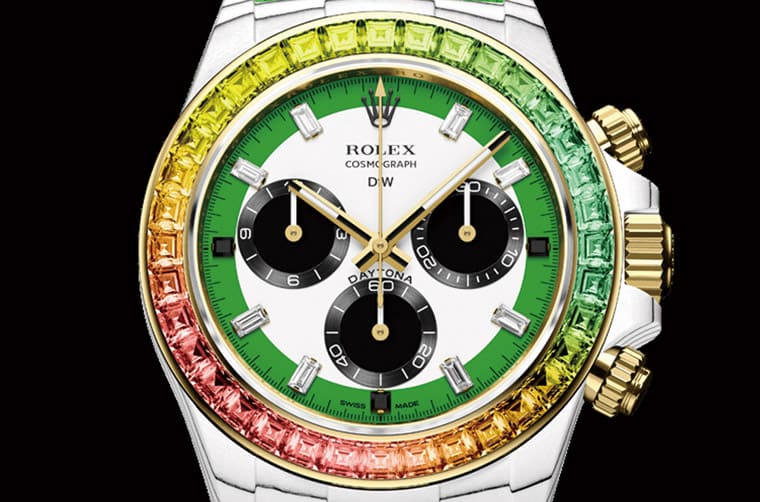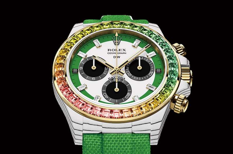 Designa Individual Watches(DiW)受到勞力士Daytona彩虹圈116595RBOW爆紅的啟發,近年也陸續創作出表圈鑲有彩色寶石的Daytona改表,本次要介紹的就是其中一款Rainbow Wild Green,顧名思義手表的表圈鑲上的鉆石主要以綠色調為主,再搭配上黃、橘、紅等暖色系寶石,使得手表看起來生氣蓬勃,展現出源源不絕的活力個性。