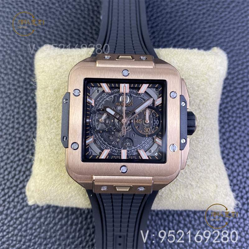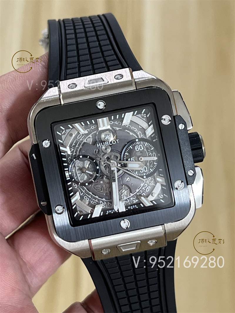 全新核心作品 HB SQUARE BANG UNICO系列,宇舶方形五級鈦金+高透藍寶石字面+一鍵快拆系統,6點鐘位置設有清晰可見的導柱輪,42mm。全透也是方形的設計精品可以說很少,bbf出,zf的宇舶也是這個代工的,做工信心有保證!計時機芯也是7750計時,凡是計時表除了迪通拿之外,復刻表統一7750,看到假表的計時款基本不用再問我什么機芯了。