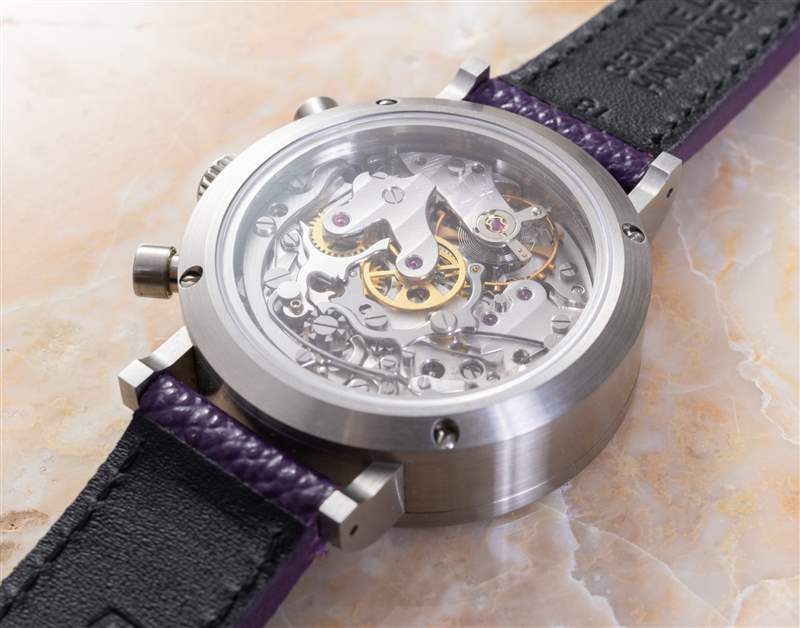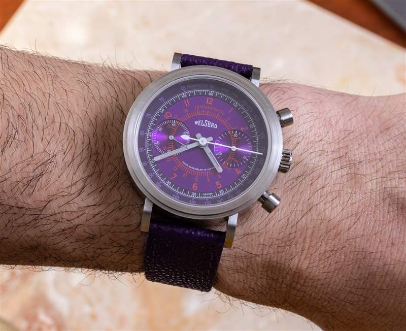 精鋼表殼寬38毫米,厚12毫米。我一般不喜歡戴38毫米這么小的手表,但是當與這樣較厚的表殼結合在一起時,戴在手腕上就感覺不那么小了。表耳之間的距離為 46 毫米,表殼不具備防水功能。我不認為這意味著你不能把它弄濕,但我不確定這個箱子是否已經正式經過任何壓力測試,因為它的產量很少。表殼采用18毫米寬的表帶,搭配一條出色的“茄子”色“鵝卵石”皮表帶,非常出色,不僅是表帶的貼合度和光潔度,還在于紫色的吸引力(和陽剛)。2023 年 4 月,aBlogtoWatch 發表了我關于未來幾年將流行的腕表顏色的文章。我在那里提到了紫色調,我認為紫色調可能是男士手表顏色的一個新興領域,但尚未得到太多探索。我認為,如果你想證明男士紫色手表在未來幾年的價值,Welsbro Grape Soda Chronograph 是一個理想的典范。