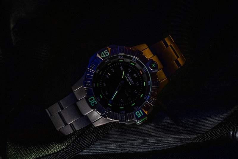 雖然 Traser 手表以其 Trigalight 氚充氣管而聞名,但該品牌并不回避使用光反應發(fā)光材料,而 Traser P99 T Tactical 將兩者混合到其低光顯示屏中。氚管出現(xiàn)在所有三個指針以及每個 12 點鐘標記上,雖然 P99 T Tactical 上的絕大多數(shù)發(fā)光材料發(fā)出綠色光,但這些管子位于 12 點鐘標記處和 12 點鐘標記內(nèi)。秒針均發(fā)出橙色光,以提供卓越的一目了然的對比度。另外兩個氚管出現(xiàn)在表盤上半部分的 Traser 標志內(nèi),而另一對氚管以十字線形式放置在表圈零標記內(nèi)的密封膠囊內(nèi)。