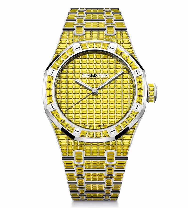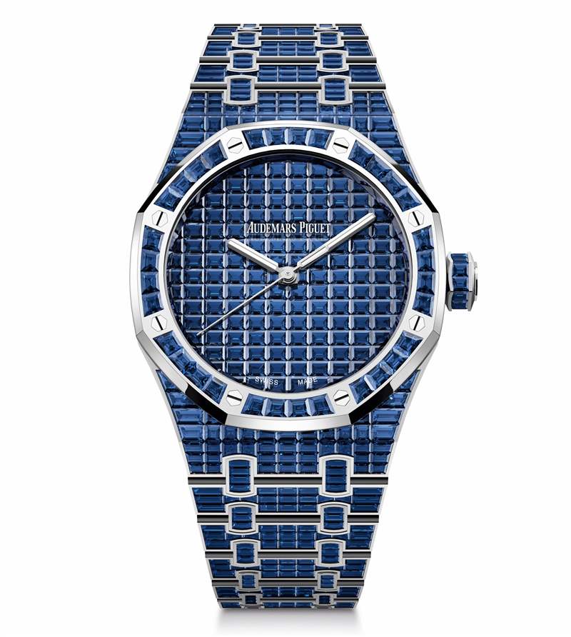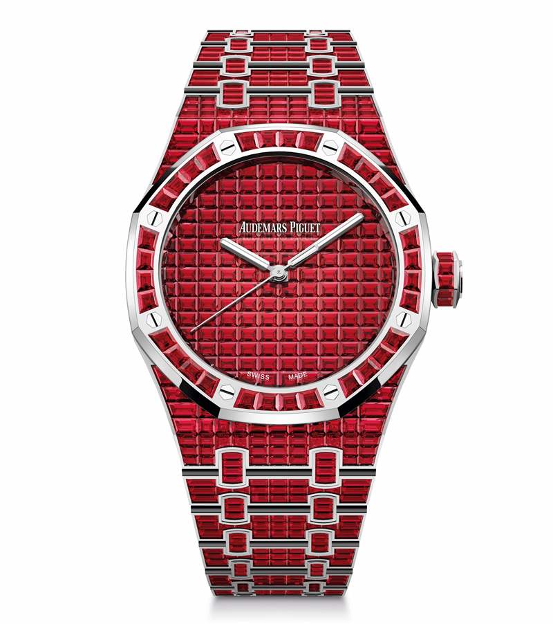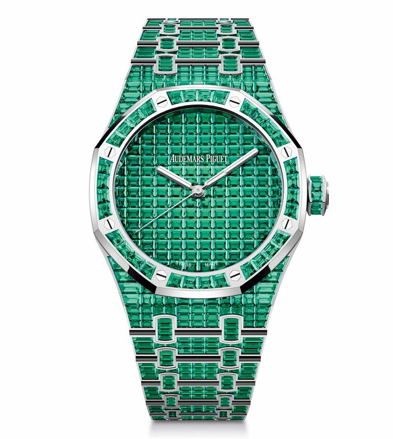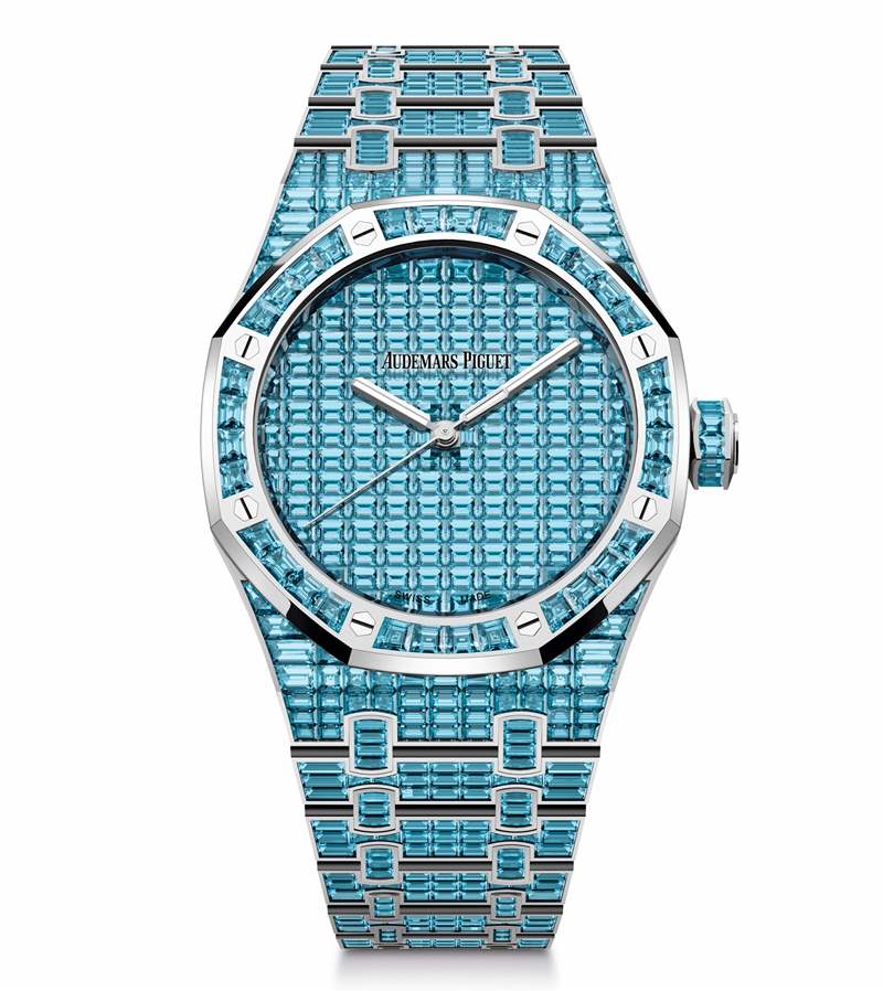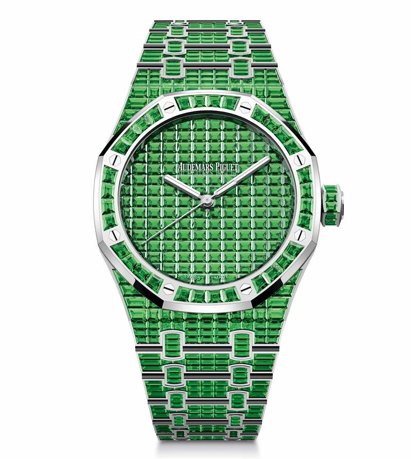 Audemars Piguet 剛剛推出一組風格華麗的寶石鑲嵌版皇家橡樹——「Royal Oak Selfwinding Rainbow Sets」,每一枚的表圈、表盤和表鏈均鑲嵌滿定制切割的彩色寶石,提供藍寶石、紅寶石、祖母綠、坦桑石、金綠寶石等多達10種彩色寶石選擇,滿足你對色彩的所有想象。