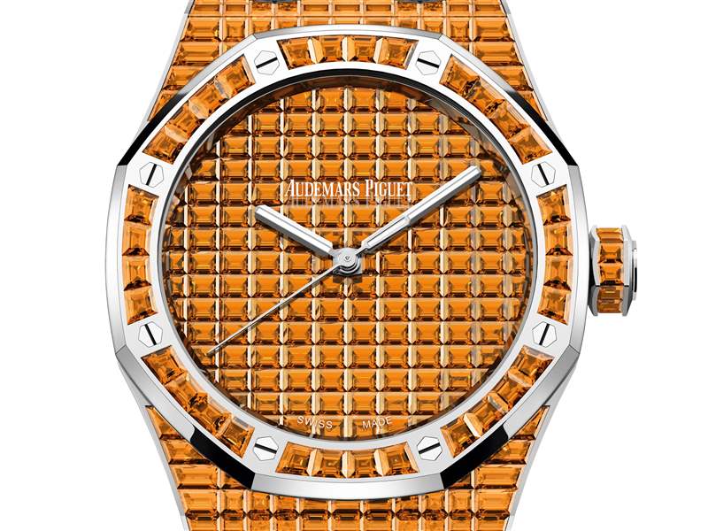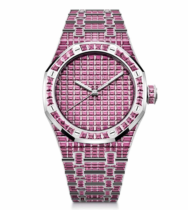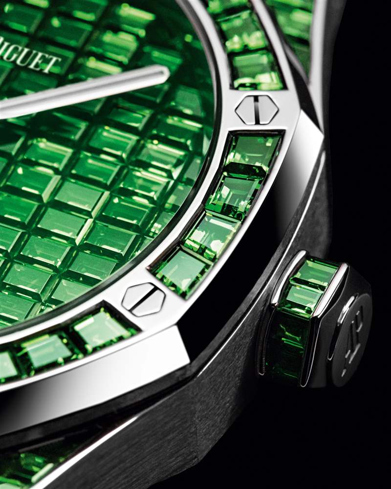 Audemars Piguet 在新系列中使用10種不同顏色的寶石——紅寶石、橙色錳鋁榴石、黃色金綠寶石、沙弗萊石、祖母綠、藍色藍寶石、藍色托帕石、坦桑石、紫水晶和粉色碧璽,每枚腕表的寶石都需要經過進行挑選和切割,確保顏色和凈度完美統一。