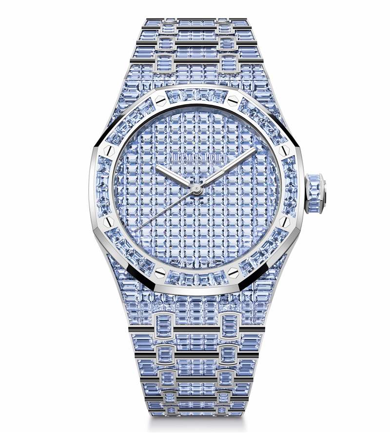 新作提供37mm和41mm白金表殼兩個尺寸版本,其中41mm表殼版本鑲嵌861顆寶石,定制切割出179種不同尺寸以適應表盤及表鏈輪廓,隱秘式鑲嵌工藝使得寶石顆粒之間完美貼合;37mm表殼版本鑲嵌790顆寶石,包含153種定制切割尺寸。