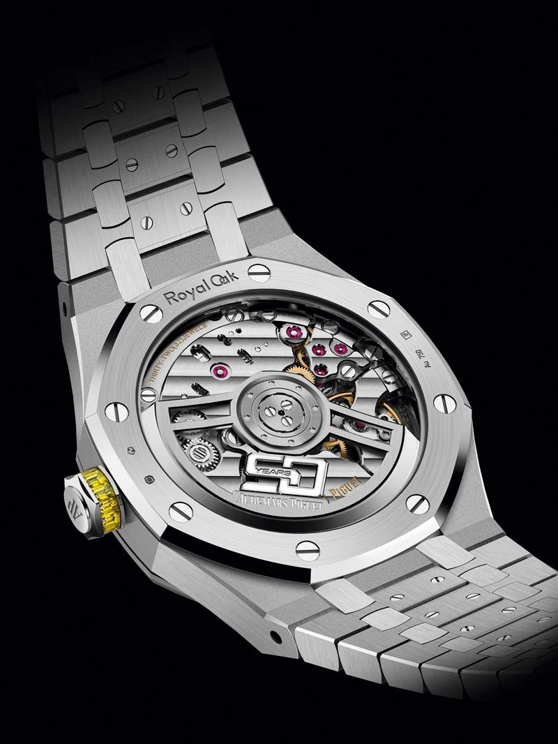 41mm腕表搭載 Caliber 4309 自動上鏈機芯,動力儲備70小時;37mm腕表則搭載 Caliber 5909 自動上鏈機芯,提供60小時動力儲備。兩款機芯均配備 Royal Oak 50周年特別版擺陀。