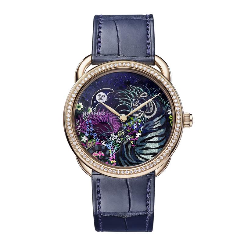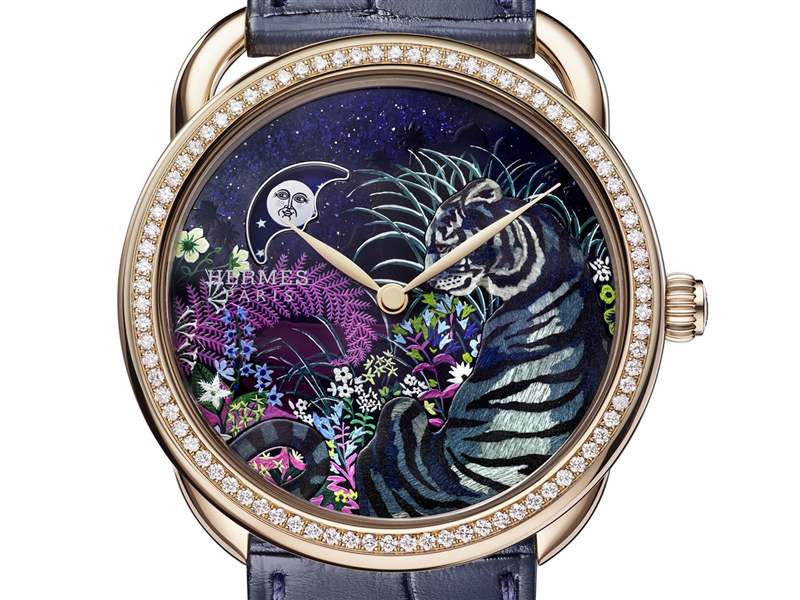 「Arceau Tyger Tyger」虎虎生威腕表描繪一只猛虎藏身于灌木叢中的自然場景——月相盤巧妙「懸掛」于深藍(lán)色砂金石表盤,這只老虎采用細(xì)木鑲嵌工藝制作,通過235枚不同顏色的手工上色木片鑲嵌拼出虎紋,木材的天然紋理讓虎毛的質(zhì)感栩栩如生,手工上色細(xì)節(jié)創(chuàng)造出微妙的明暗與光影效果。
