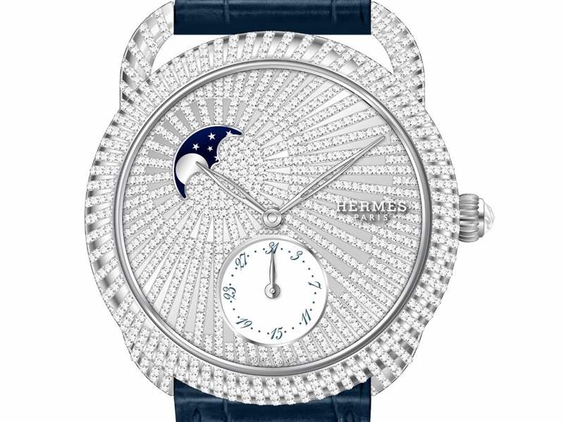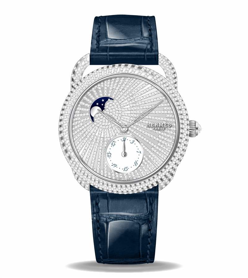 珠寶腕表中最引人注意的是一枚「Arceau Petite Lune」小月相腕表——以10點(diǎn)的月相盤為中心,通過1084顆明亮式切割鉆石在表盤、表殼及表耳上勾勒出放射狀線條,在白金盤面的襯托下熠熠生輝,如同皎潔的月光鋪灑大地,風(fēng)格浪漫而充滿詩意。