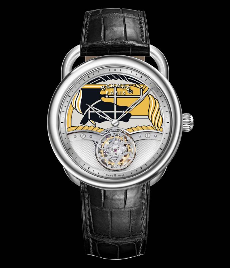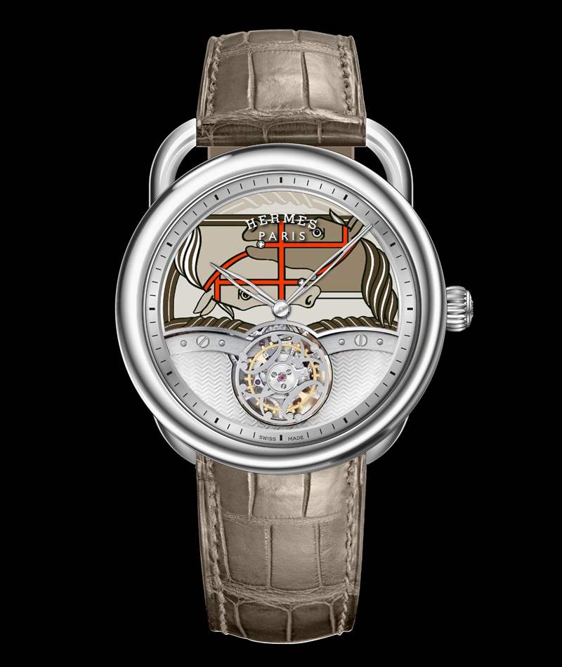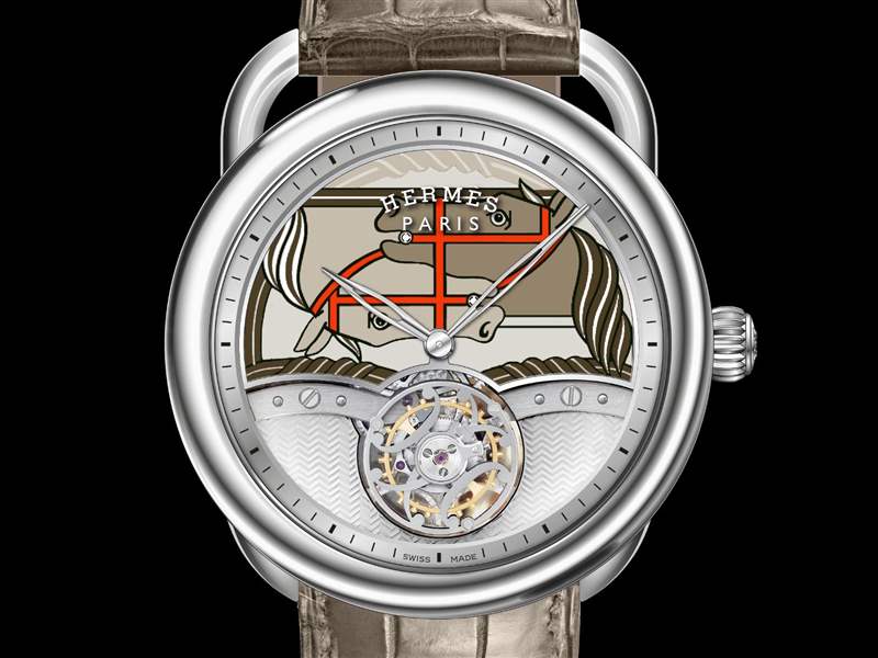 Arceau 系列本次推出一款復(fù)雜功能作品——「Arceau Quadrige」飛行陀飛輪腕表,表盤以掐絲琺瑯工藝塑造出抽象風(fēng)格的駿馬圖騰,每一枚表盤的琺瑯圖案均需經(jīng)過多次燒制。飛行陀飛輪框架的「雙H」元素源自巴黎圣奧諾雷市郊路 Hermès 精品店的鐵藝裝飾,陀飛輪兩側(cè)裝飾幾何璣鏤紋理。