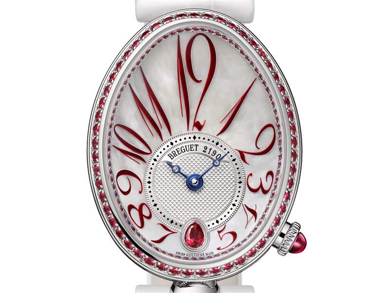 新作以紅寶石取代 Reine De Naples 系列的鉆石鑲嵌——超過100顆紅寶石勾勒出鵝蛋形表殼的圓潤輪廓,突出白金表圈的纖細構造。溫婉的白色珍珠母貝表盤搭配酒紅色時標,偏心式時分盤裝飾精致的璣鏤雕紋,賦予腕表幾分微妙的古典氣息,6點鑲嵌一顆水滴形切割紅寶石成為點睛焦點。