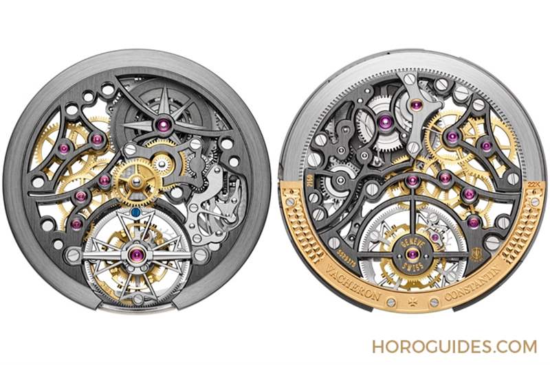 此表款所搭載的江詩丹頓自制2160 SQ機芯,是以2160機芯為基礎所重新設計-搭載于Overseas陀飛輪腕表。在施以鏤雕后,機芯總重減少20%,整體架構煥然一新。機芯厚度僅5.65mm,采用金質環形自動盤,因而有更多空間可裝置陀飛輪框架。機芯零件與發條盒表面皆經NAC電鍍處理呈煤灰色,現代感十足。發條盒與盒蓋均被施以鏤雕,位于表盤那一側呈風向玫瑰羅盤造型,這也是2160 SQ機芯的特色之一。