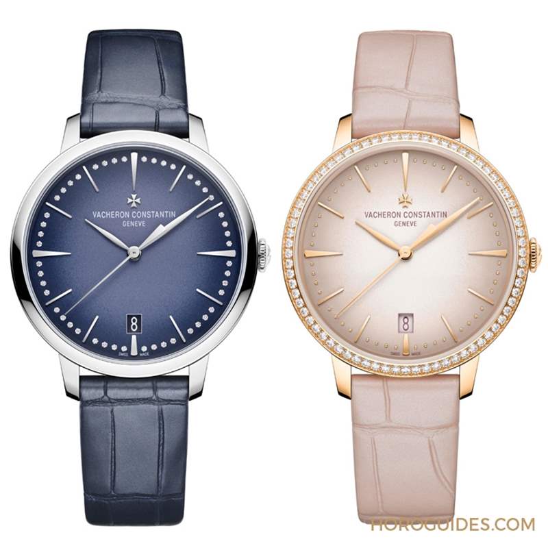 今年發布的四款Patrimony自動上鏈腕表新作以改版新面貌亮相,內斂精致依舊,尺寸比例經過調整,圓弧線條經過重新設計,表冠略帶弧度,鑲貼時標的前后兩端也略帶弧度;此外,日期窗的造型也經過調整,將原本強調出深度的傾斜面,改為更顯俐落的垂直面并加上與logo字體相同色調的邊框。纖細的表圈,或鑲飾鉆石或施以拋光,光潤閃耀的纖細表圈畫出一道閃耀的光圈,完美的圓弧定義出屬于古典主義的優雅,18K白金表殼搭配深藍色表盤,18K 5N粉紅金表殼搭配胭粉色,表盤顏色呈漸變效果,表盤中心至邊緣由淺到深。