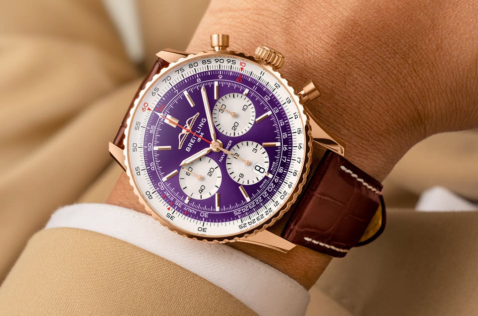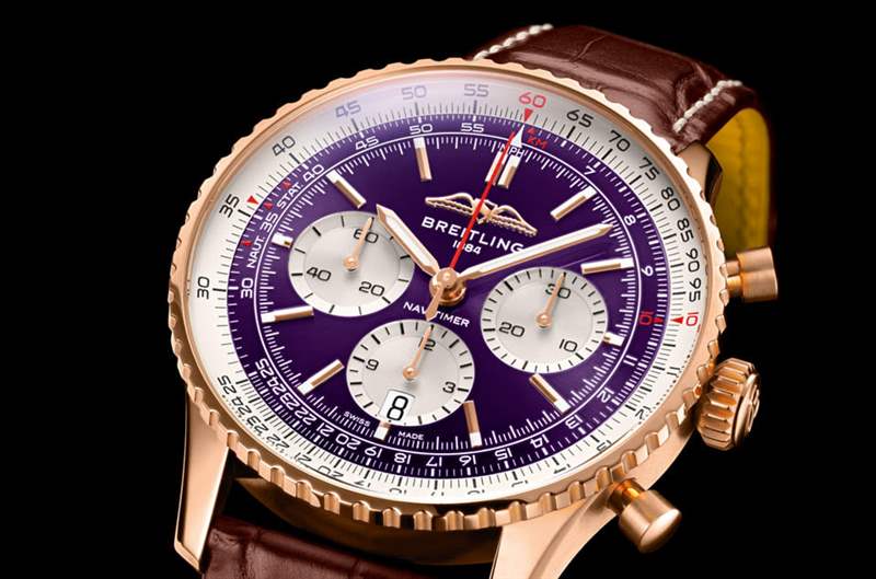 ▲表款采用玫瑰金材質(zhì)搭配紫色面盤,結(jié)合Navitimer經(jīng)典的環(huán)形飛行滑尺、計時功能等設(shè)定,賦予手表同中求異的收藏魅力。