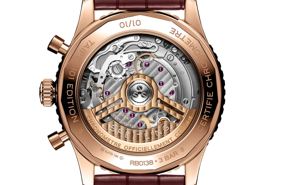 除了面盤的罕見配色,表背透明底蓋也還有其他驚喜,佩戴者在一睹精密的B01自動機(jī)芯之余,包括鏤空自動盤、日內(nèi)瓦波紋、緞面修飾等都具有一定水準(zhǔn),甚至也能窺見傳統(tǒng)計時碼表不可或缺的導(dǎo)柱輪機(jī)制,以及擒縱系統(tǒng)即時的運(yùn)作動態(tài),從自動盤邊緣鐫刻的文字可知機(jī)芯通過瑞士天文臺認(rèn)證,確保其走時品質(zhì)值得信賴。前面提到的驚喜就展現(xiàn)在透明底蓋邊緣的K金部分,百年靈鐫刻了”TAIPEI 101 EDITION”字樣以及手表的限量編號(限量10只),凡此都增添了手表珍貴的收藏意義,因此一推出詢問度也非常高,成為最近百年靈的話題明星。