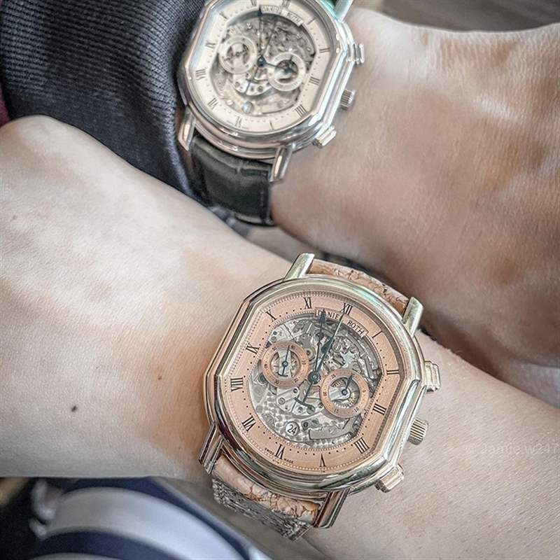 我喜愛手表已有好一段時(shí)間,主要關(guān)注最知名的品牌,例如勞力士和卡地亞等等。在第二個(gè)寶貝(是個(gè)男孩)出生后,我和另一半討論:如何可以表達(dá)我們對他的愛?我們認(rèn)為出生年的表是個(gè)很棒的方式,于是開始尋找具有悠久歷史且能經(jīng)年傳承的品牌。在幾個(gè)候選的品牌中,最后我們找到了一只朗格1815 Up/Down Suarez限量版(是西班牙的鐘表珠寶經(jīng)銷商Suarez為慶祝75周年而出的20只限量版);它的獵表式表背上有著非常漂亮的雕刻。這只表符合我們設(shè)定的主題,而且它的編號和我們兒子的生日相同。從那時(shí)候起,我們成為了一個(gè)愛表的家庭,開始探索各個(gè)品牌的故事。隨著我們越投入,也就越沉浸在鐘表的世界里。于是我們開始收藏更多具有不同故事的手表。