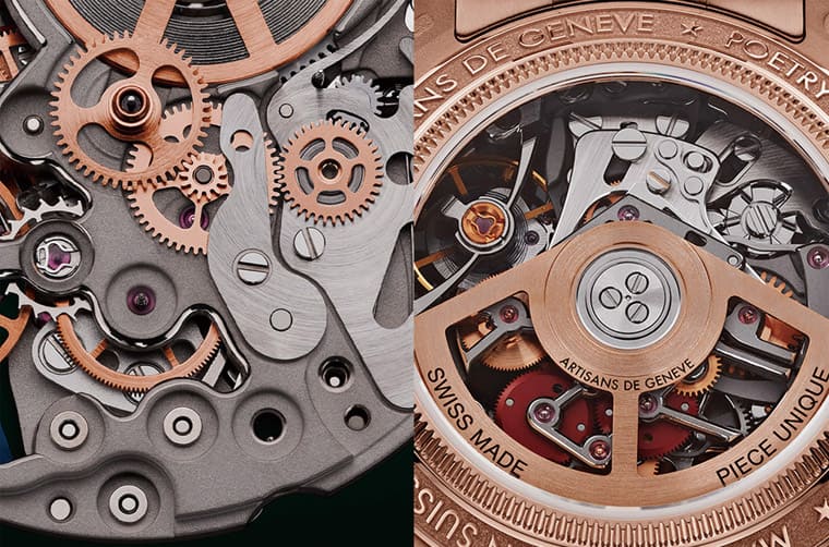 Artisans de Genève替手表選用玫瑰金重新制作自動盤,并將之鏤空,同時根據表主的意見加以倒角修飾,同時也還手工替自動盤上的刻字上色,使其充滿濃濃的工藝氣息。