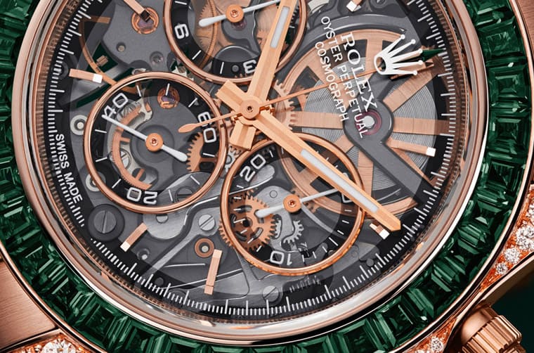 光之詩這款改表把客戶的愿望具體實現了,手表的確不僅是鑲上寶石和鉆石如此簡單,Artisans de Genève也用本身精湛的工藝水準重新改造了4130機芯,并在手表正反面大方秀出這些展現進階制表技術的成果,過程中反而最花時間的是搜集寶石的階段,為了讓手表看起來和諧且賞心悅目,每顆寶石的色澤都已經做到力求接近一致的地步,改裝完成后的116505有一種脫胎換骨的感覺,既有珠寶點綴,又展現出高級表的風范,佩戴在手上的滿足感想必很巨大。