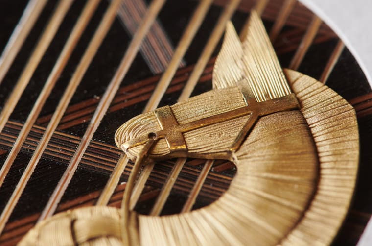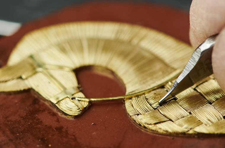 懷表在制作過程中,要先選擇不同色調的馬鬃,并且剪裁出不同長度,接著品牌工藝師要按照原先計劃好的Masan-Masan絲巾圖案,在面盤上將馬鬃一一黏合組成圖案。不同色調的馬鬃利于工藝師呈現主題物件的立體感與對比性。而在另一匹駿馬的部分,工藝師純憑雕刻工具,在黃金上一刀一刀刻出駿馬的輪廓,以帶有編織紋路感的線條,將愛馬仕的設計雛形具體化為現實。