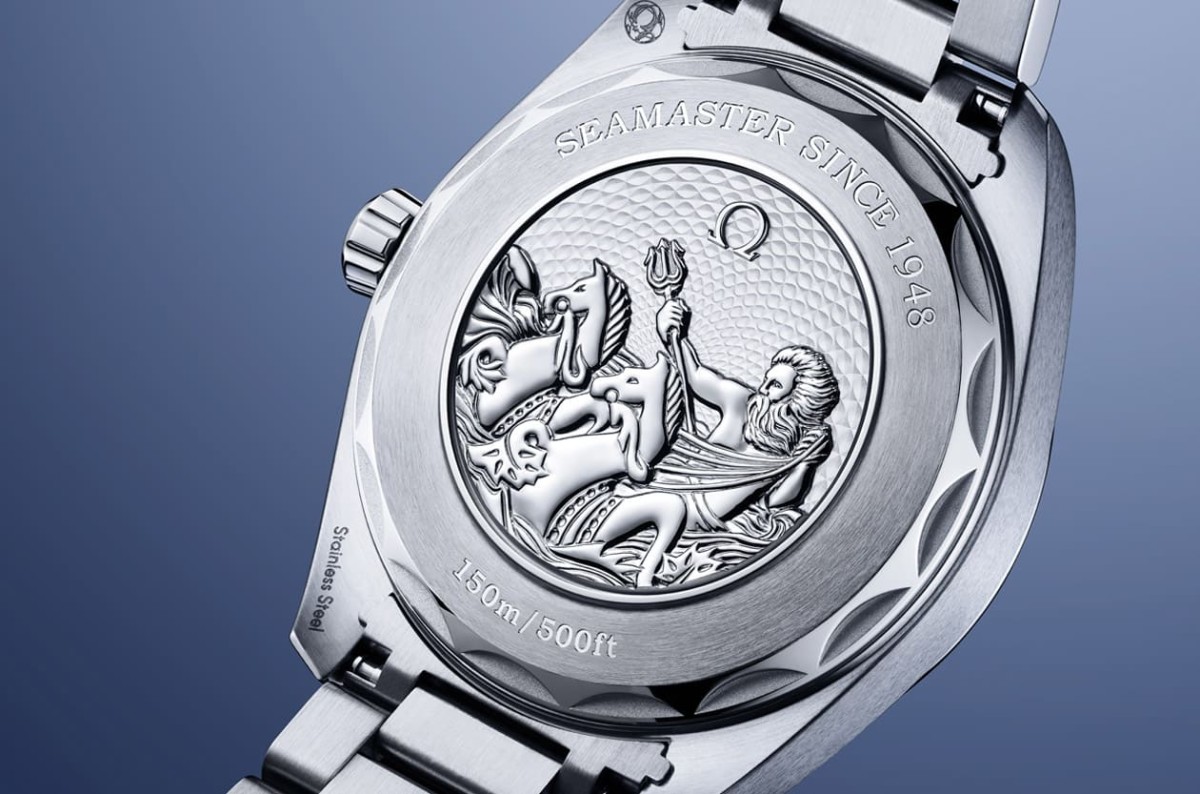 ▲歐米茄別出心裁將1956年古董海馬腕表上的原創(chuàng)圖騰帶回現(xiàn)代表作中,圖中可見手持三叉戟的海神波塞頓駕馭海馬座駕的威嚴(yán)氣勢。