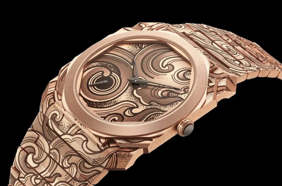 寶格麗為了讓刺青大師好好發揮他的繪畫實力,因此Octo Finissimo Tattoo Fuoco的面盤僅保留時、分與小秒針,表面不留任何時標乃至品牌Logo;有趣的是,Mo Coppoletta精心在7 ~8點方向雷雕出一個漩渦的中心,剛好成為小秒盤旋轉的舞臺,而時、分指針本身經過鏤空處理這時顯得格外重要,佩戴者能夠更盡興地欣賞面盤上充滿創意、才氣與深刻寓意的圖騰。