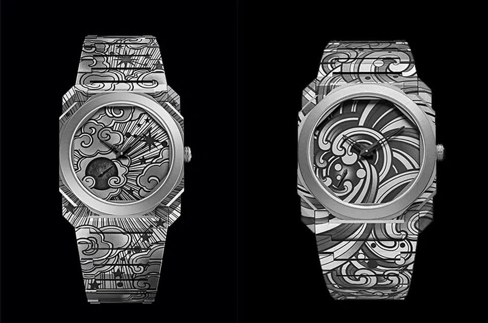 ▲寶格麗2021年與2022年先后推出的Octo Finissimo Tattoo Aria(左)和Octo Finissimo Tattoo Acqua(右),兩者皆為鈦金屬材質。