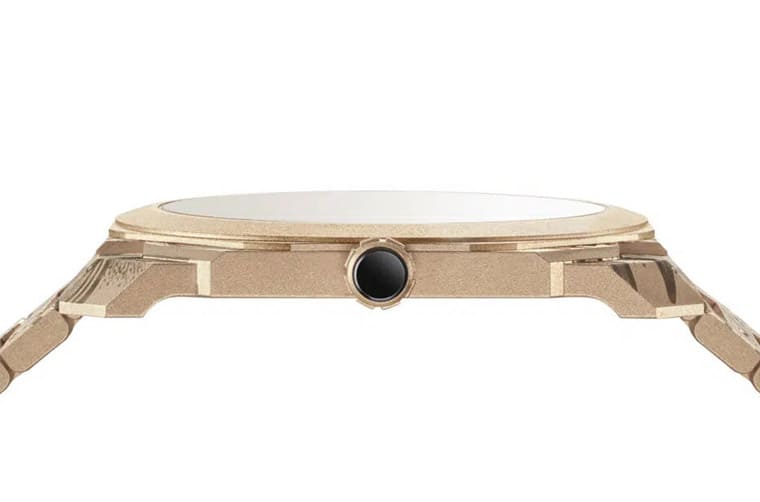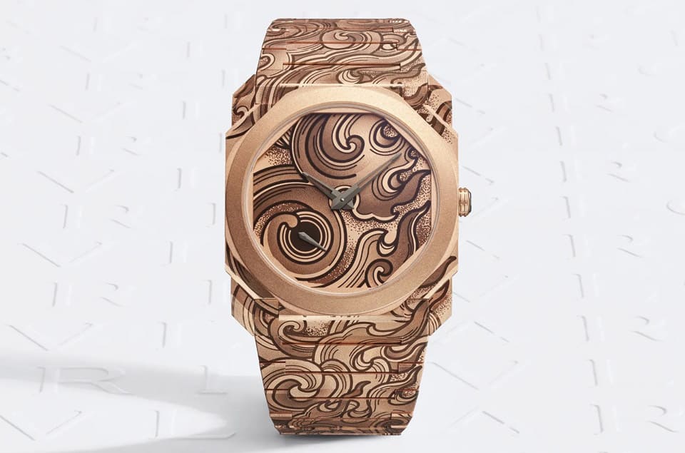 Octo Finissimo Tattoo Fuoco的玫瑰金表殼同樣采用霧面噴砂處理,因此它的外觀并不會金光閃閃,噴砂后的玫瑰金表圈相形低調,但因為手表布滿顯眼的黑灰色系圖騰,加上此系列招牌的八邊形表殼以及僅5.15mm的表殼厚度等特色,都讓手表成為手腕上難以忽視的強勢單品。