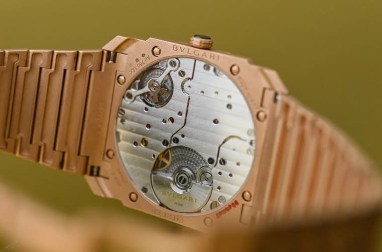 相較于外觀的獨特性,Octo Finissimo Tattoo Fuoco表背則與一般的Octo Finissimo超薄自動表大同小異,透明底蓋露出手表搭載的BVL 138自動機芯,其采用微型自動盤設計,使得機芯厚度得以控制在2.23mm的超薄程度,機芯底板飾有大片日內瓦波紋,另外零件邊緣的倒角拋光等,也都展示出其蘊含精致作工的水準。這枚機芯震頻為21,600vph,動力儲存有60小時,實用性相較多數超薄手表都不會遜色。