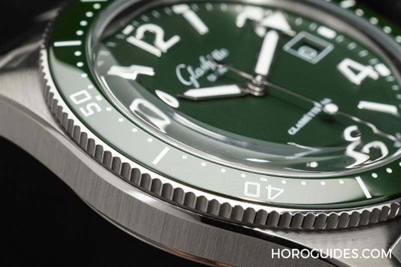 表款搭配綠色的單向旋轉陶瓷表圈,所有的數字都附有圓點分鐘刻度,為了避免意外碰撞觸動,表圈的旋轉手感是比較緊的,轉動時可以感受到細密的格數,又是另一種細膩的體驗。
