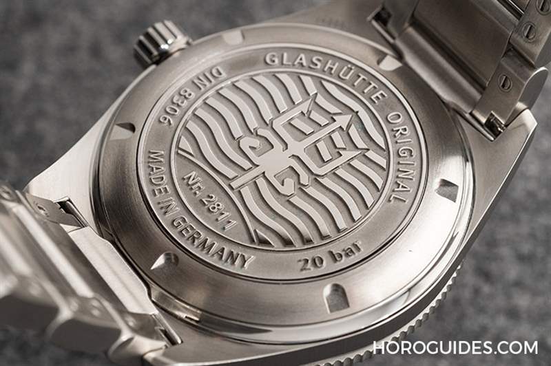 另一方面,SeaQ在打磨方面也展現出德國制表最為人稱道的細膩工藝。整枚表殼雖然沒有分件,但是透過打磨修飾自然地在不同角度呈現出相對應的光影變化。例如同樣是拉絲打磨,表耳正面為了配合表圈的形狀因此做出了弧形線條、表側則是非常齊整的垂直拉絲,再搭配一道窄版的邊緣亮面倒角,即使你自認是個挑剔的表迷,像這樣連視覺方向性都考慮得到、搭配得宜的表面修飾,應該也足夠讓你佩服了。
