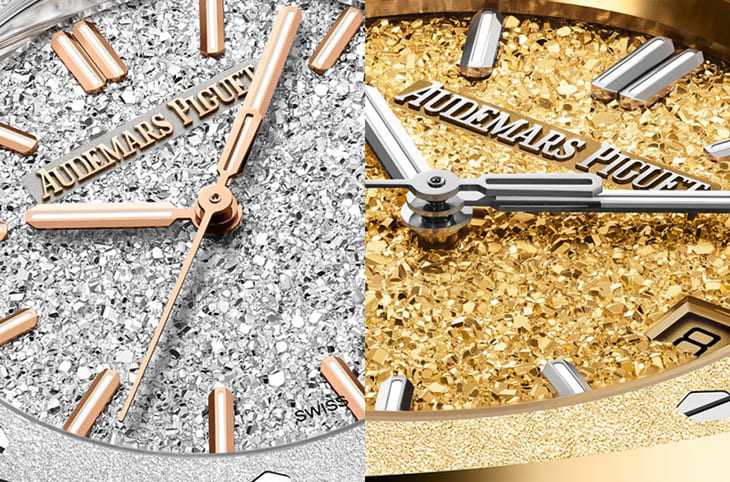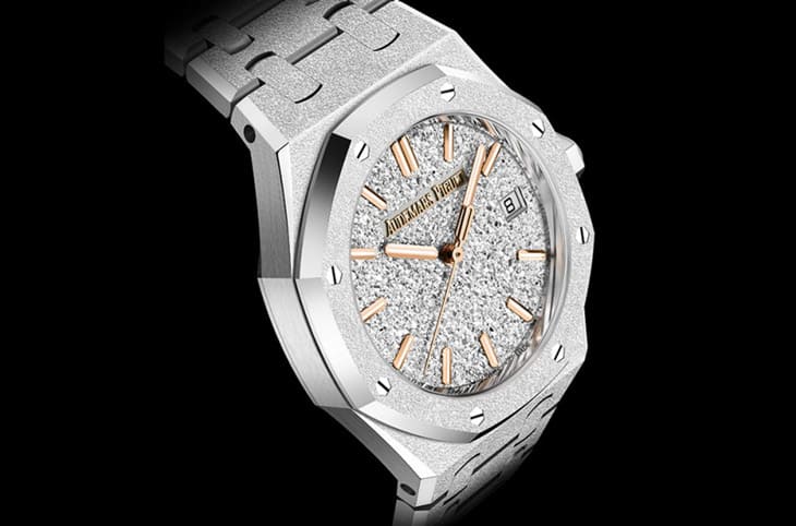 新款皇家橡樹霜金自動表提供黃金與白金兩種款式,尺寸為34mm,適合不同佩戴者的喜好。表殼與表帶均采用霜金工藝修飾,展現出與眾不同的奢華感。