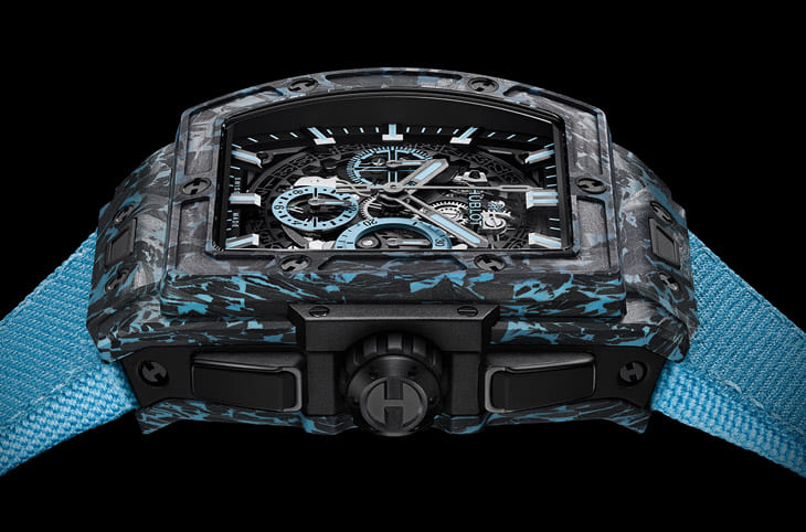 Spirit of Big Bang迷彩藍碳纖維計時碼表在細節設計上同樣引人注目。