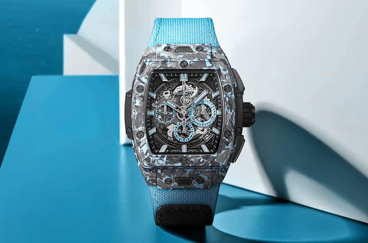 HUBLOT宇舶品牌以其創新精神和科技材質研發而聞名,最新推出的Spirit of Big Bang迷彩藍碳纖維計時碼表,以其獨特的夏日迷彩藍外觀,為炎炎夏日帶來一抹清爽。