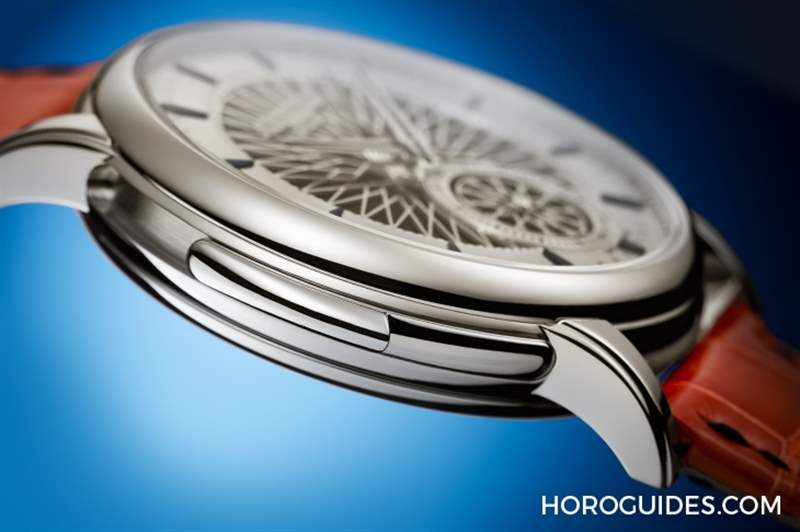 除了三問機能的革命性提升之外,ref. 5750P 另一個引起關注的焦點,則是跳脫品牌經典樣貌的設計,大大的沖擊了我們對百達翡麗腕表既有的典雅的印象。而這次在經典的三問表設計中,大膽嘗試用1960年代古董車的網狀輪框作為靈感來源,面盤的中空輪幅裝飾在背景的黑色蝸形螺旋刻紋襯托下,充滿動感的鮮明風格確實帶來了耳目一新的印象。這是百達翡麗在總裁夫人Sandrine Stern 掌管設計部門以來,最令人驚喜的設計,把「先進研究」的概念作了相當有意思的詮釋。