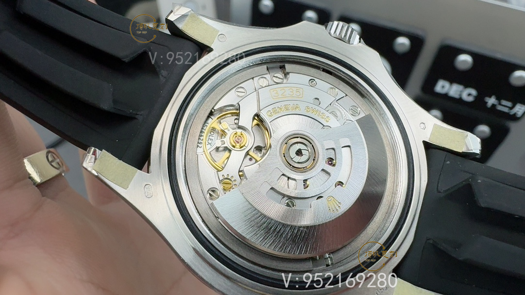 配重與表殼工藝: 這次的V3升級版在配重上做了重大改進,整個表殼包括厚底蓋都是一體加工而成的配重表殼,重量接近原裝18K白金版本。厚底蓋的重量比普通不配重的版本重很多,使得整表的重量達到了148.4克,非常接近原裝。