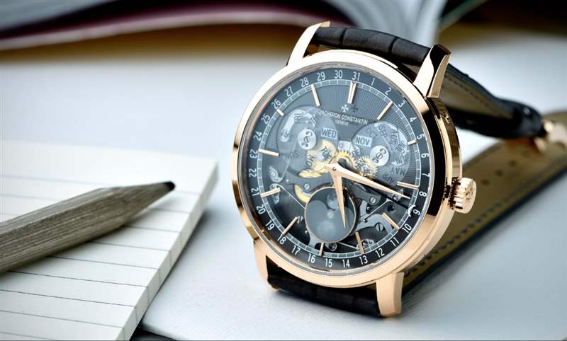 表徑41mm的Traditionnelle全日歷腕表,具備此系列的識(shí)別性特色-階梯式圓形表殼、凹槽底蓋、纖細(xì)表圈、軌道式分鐘刻度圈、雙刻面太妃針與金質(zhì)時(shí)標(biāo)。表盤由三部分組成—乳光暗灰色外圈,設(shè)有中央日期指標(biāo);暗灰色表盤,頂部飾有機(jī)刻雕花(guilloché)圖案;覆以透明的藍(lán)寶石水晶表盤,并點(diǎn)綴金質(zhì)鑲貼時(shí)標(biāo)。表盤下還有兩個(gè)藍(lán)寶石水晶圓盤,分別顯示星期和月份。