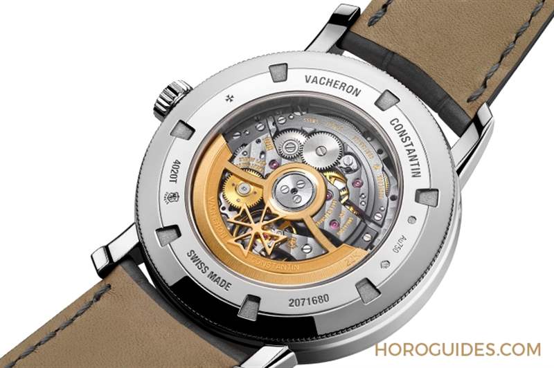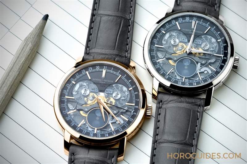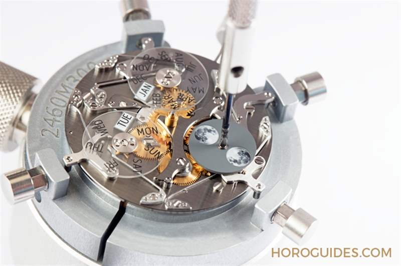 此表款所搭載的2460 QCL/2機(jī)芯,采用煤灰色NAC電鍍處理的主夾板和板橋,呈現(xiàn)出沉穩(wěn)又閃耀的效果,與表盤其它部份形成強(qiáng)烈對(duì)比,營(yíng)造出饒富深度的層次感。這枚機(jī)芯由312個(gè)零件組成,是江詩丹頓自行研發(fā)制造的首款自動(dòng)上鏈機(jī)芯2450的升級(jí)版,具備停秒裝置、40小時(shí)動(dòng)力儲(chǔ)存、三重日歷顯示、以及每122年才需調(diào)校一次的月相顯示。